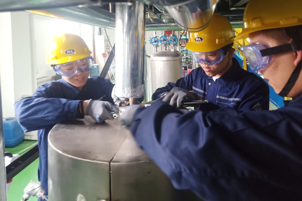 5月7日,学院化学工程系刘洪宇老师和吴春丽老师带领17级中德化工班学生维修燃料油常压蒸馏装置的漏液问题——更换密封垫片。